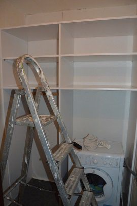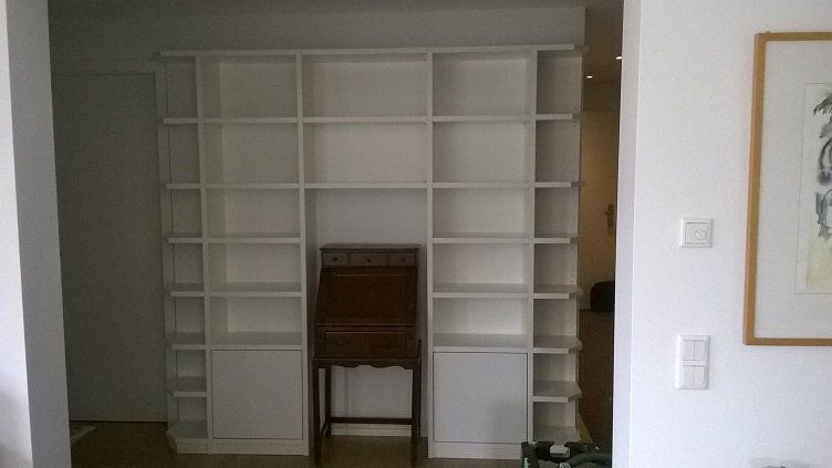 25 m-es fehér laminált szekrény polc, meglévő bútordarab köré építve