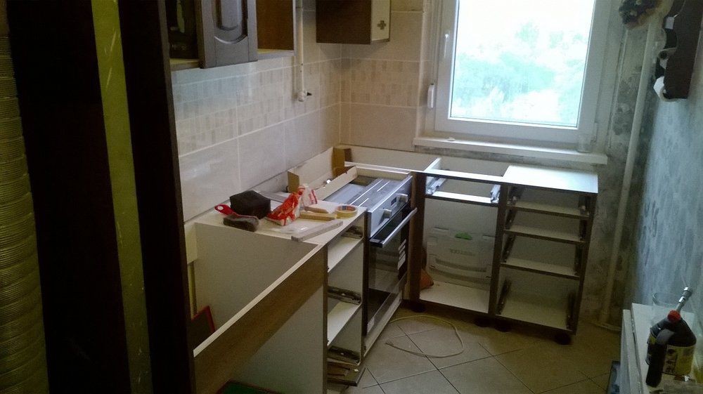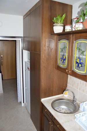 Szellőző csőveket, szerelvényeket rejtő szekrény belső tároló rekeszekkel, a hüttő fölött lévő polcos elem, szintén lakkozott tölgyfa szekrények